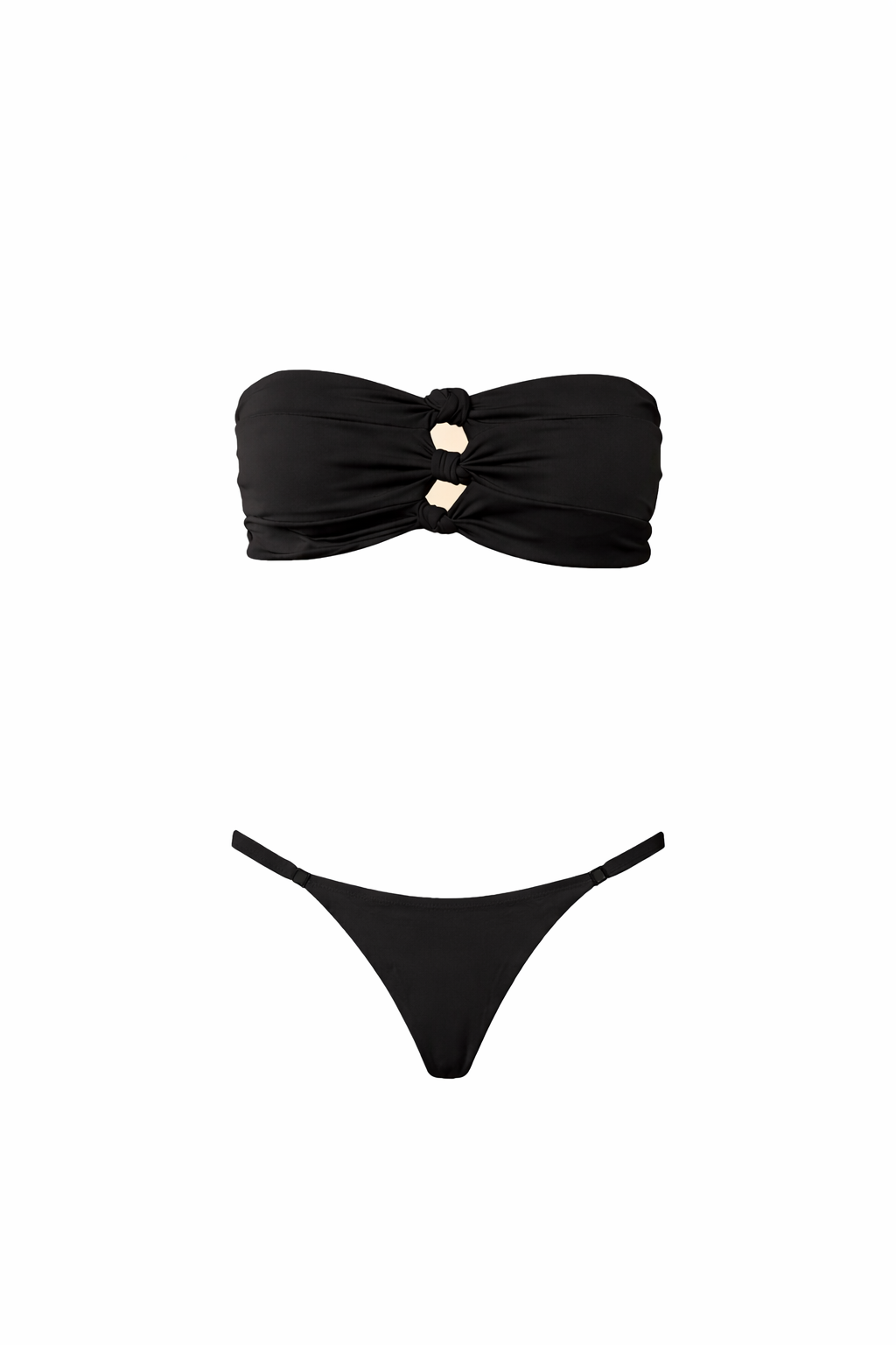 O top apresenta três delicados nós frontais, que realçam o busto e o colo de forma elegante, além de ajuste nas costas, permitindo uma regulagem prática e personalizada.